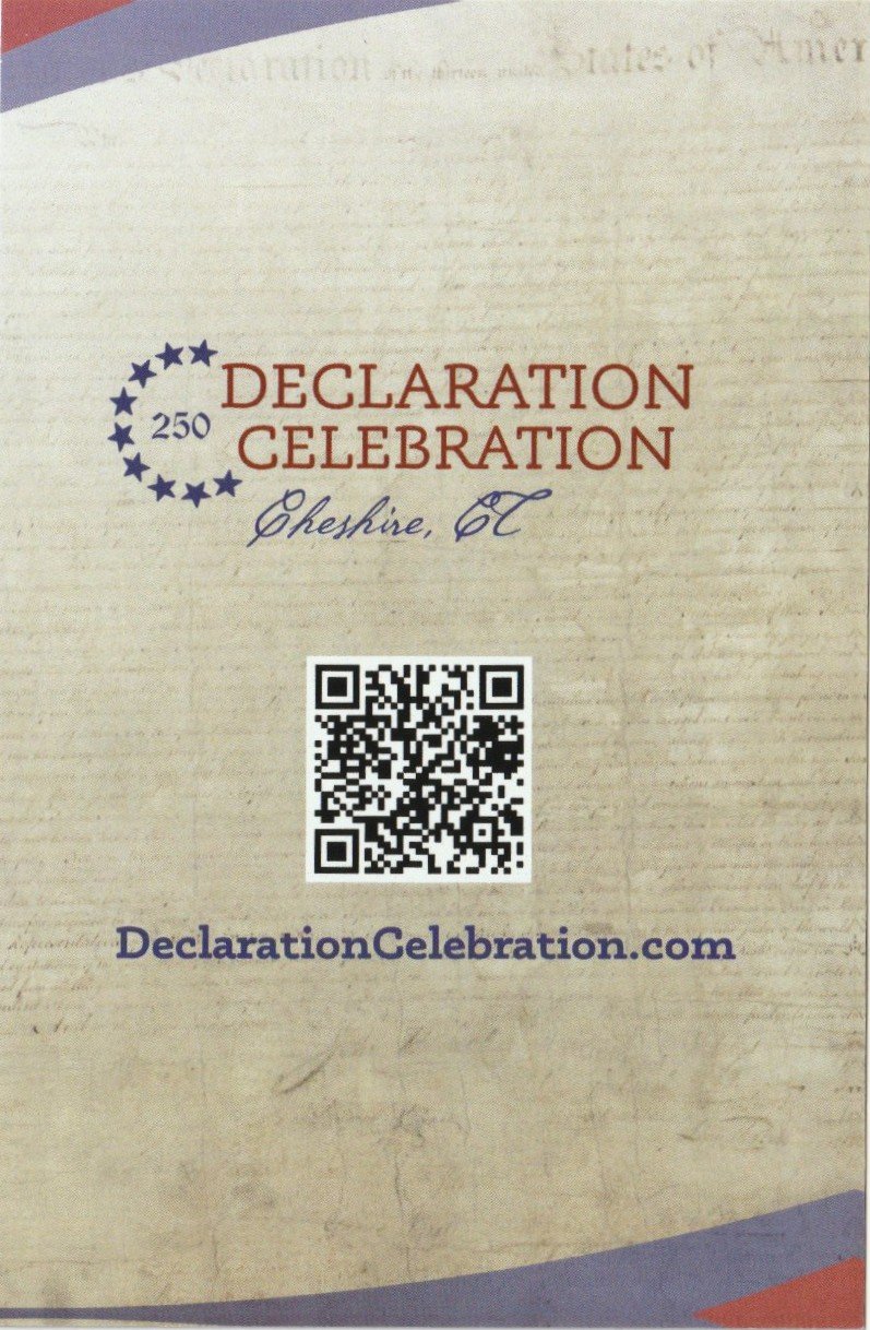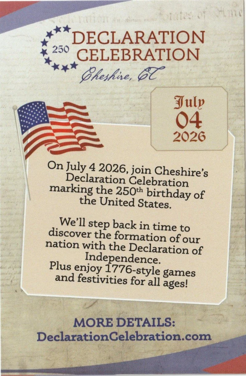 In 2026, the USA will celebrating its Sesquicentennial, or 250th birthday (a.k.a., “America 250”). The Town of Cheshire is planning many events and hopes that businesses, schools, churches, civic and community groups and others will be involved. Representatives from the Cheshire Historical Society have already been involved in the early planning sessions. The focus will be on celebrating the signing of the Declaration of Independence, calling our town event, “America Red, White and Blue.” At this point, this effort does not have any funding from either the State or the Town. As a result, the scope and success of the effort are dependent on volunteer participation and charitable donations. If you see a call for volunteers for any of the activities that are being developed, please don’t hesitate to step forward and get involved!